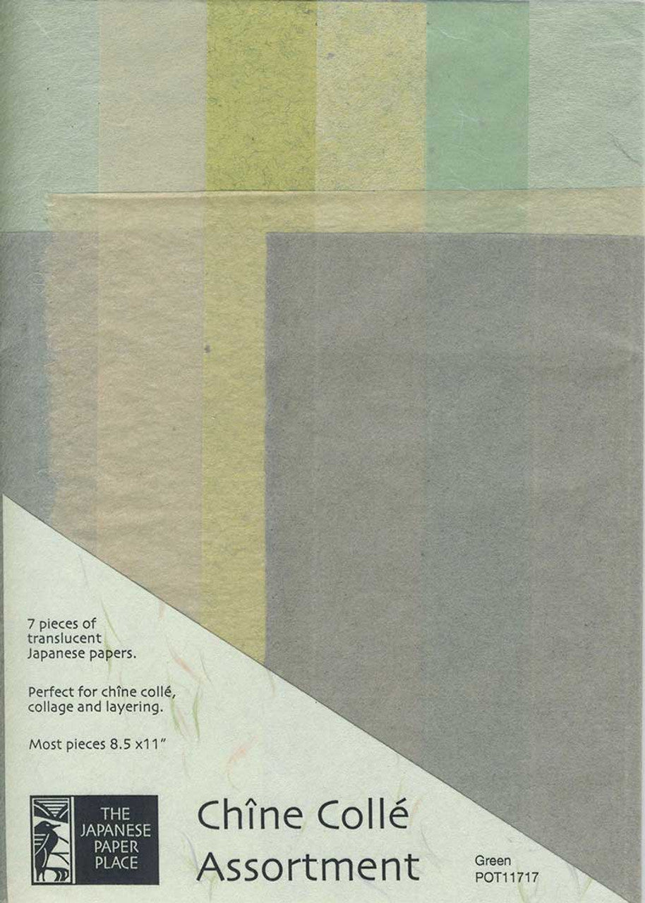 A selection of natural fibre papers for chine coll,,. Includes handmade and machine made papers in various weights and tones, featuring greens.
