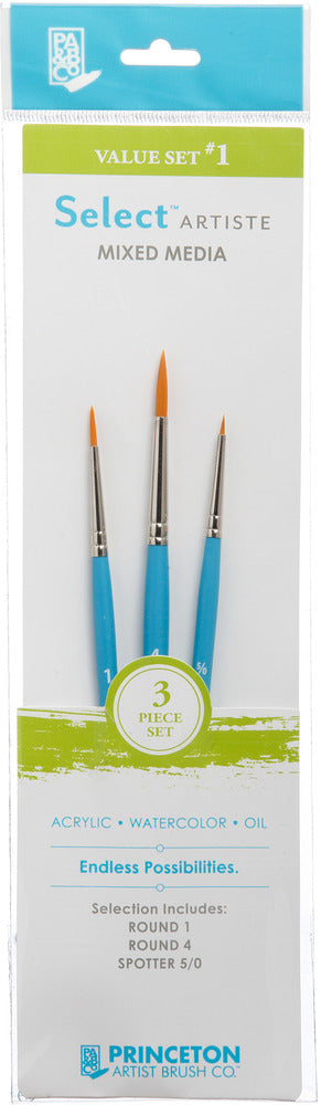 Round 1, Round 4, Spotter 5/0. Brushes suitable for Acrylic, Watercolour and Oil.