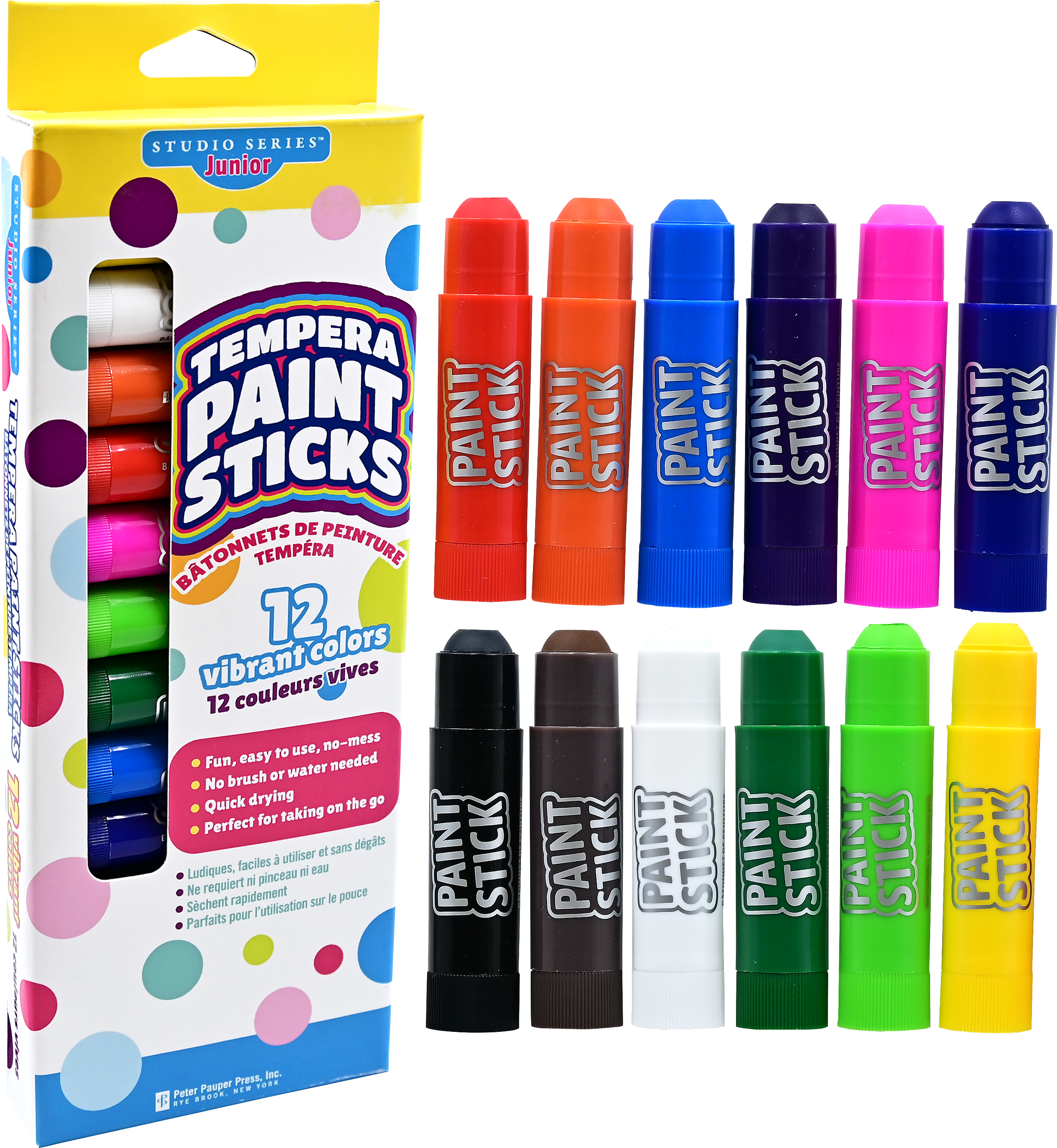 Kids will love how fun and easy it is to use Paint Sticks ! Just uncap, twist up, and paint away! No brush or water needed! And parents will love that there's no mess! Young artists can get super creative with 12 vibrant colors! Colors glide on smoothly and dry quickly. Designed especially for little hands, paint sticks are thick and easy to hold. Safe and non-toxic. Storage box keeps paint sticks safe and organized. Perfect for taking on the go! Each paint stick measures 3-1/2'' long. Box measures 4-1/8'' wide x 12'' high x 9/10'' deep.