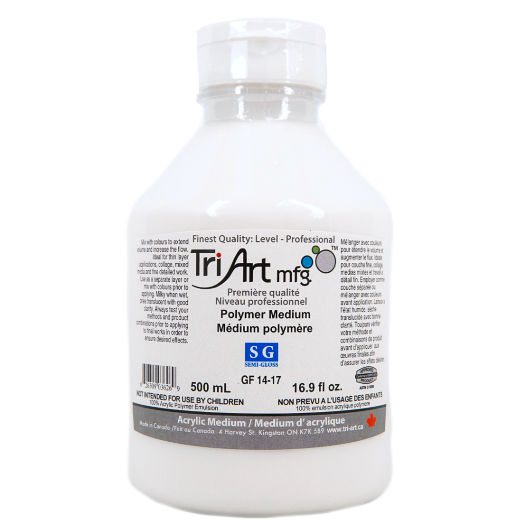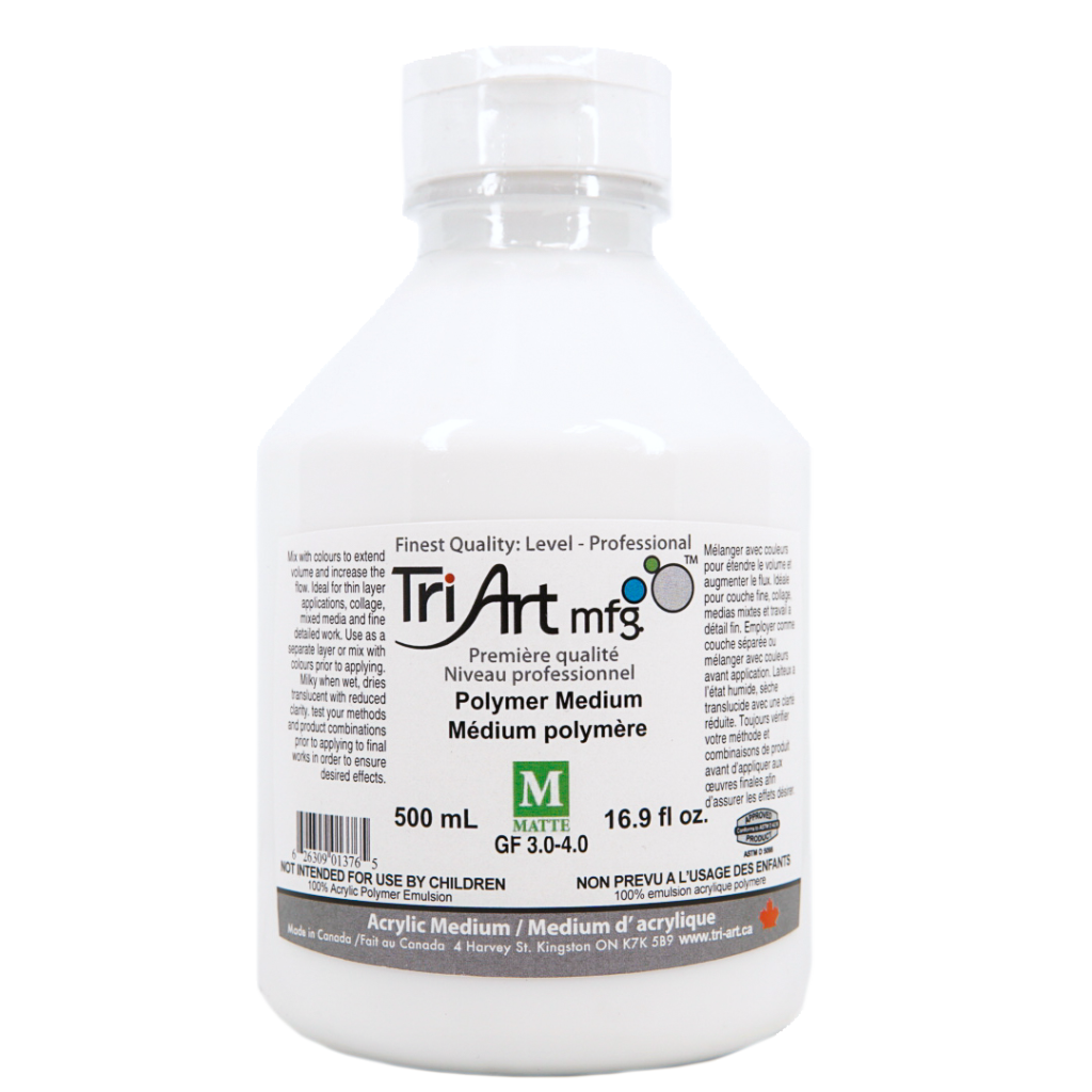 Polymer Medium is, in essence, Tri-Art Liquid Paint without pigment. It will maintain brushstrokes and light textures. It dries to a water permanent, flexible film. It will thin thick-format acrylic paint and increase the flow of colours. It is perfect for detail painting.