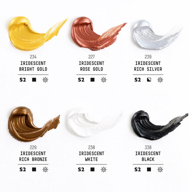 6 x 59ml Professional Heavy Body Acrylic - Iridescent Rose Gold, Iridescent Black, Iridescent Bright Gold, Iridescent Bright Silver, Iridescent White, Iridescent Rich Bronze