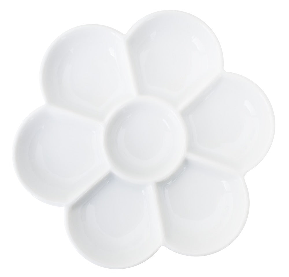This 7 section flower shaped porcelain dish measures 5" in diameter and 5/8" in depth. Made of heavy weight, high quality Japanese porcelain, these painting accessories can be used with all media. This dish is also great for storing glass seed beads, with its curved wells making it easy to pick up small beads for stringing jewelry. Easy to clean and non-staining.