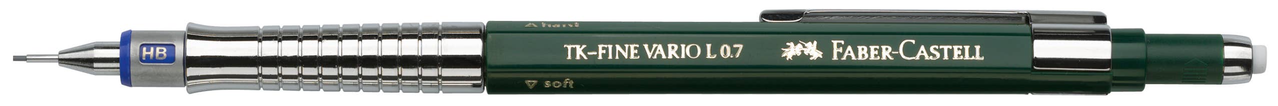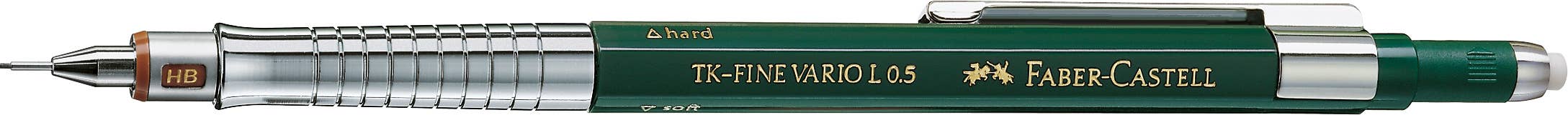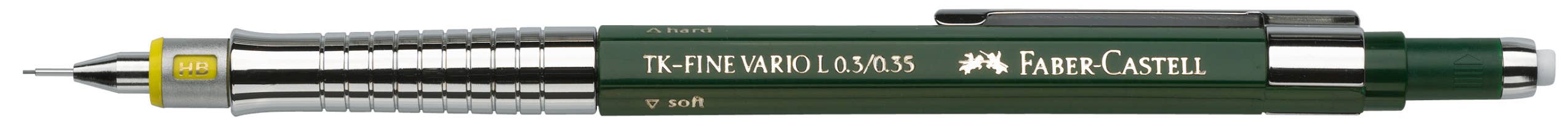 The TK Fine Vario Mechanical Pencil is ideally suited for writing and precise drawing. It has a soft/hard mechanism. When in the soft position, the lead is cushioned for writing. When in the hard position, the lead is held rigid for precise ruler-based drawing. The pencil has a metal grip section with a lead hardness indicator on the tip. The PVC-free extendable eraser is extra long. It comes with 3 Super-Polymer leads in lead hardness degree HB.