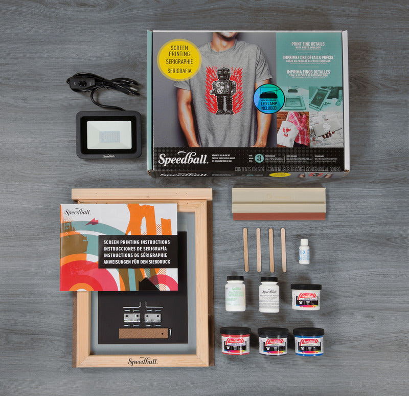 This kit includes: (1) 10"x14" Speedball Wooden Screen Frame and Base; (1) Speedball Craft Squeegee (Textile); (4) 4oz. jars of Speedball Fabric Screen Printing Ink (one each Black, Red, White, Blue); (1) 3.3oz. bottle of Speedball Diazo Photo Emulsion; (1) bottle of Speedball Sensitizer; (1) 4oz. bottle of Speedball Photo Emulsion Remover; (2) Speedball Transparencies; (1) 30W LED Exposure Lamp; (4) Craft Sticks; (1) sheet of black paper; (1) Speedball Screen Printing Instruction Guide.
