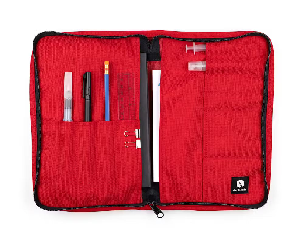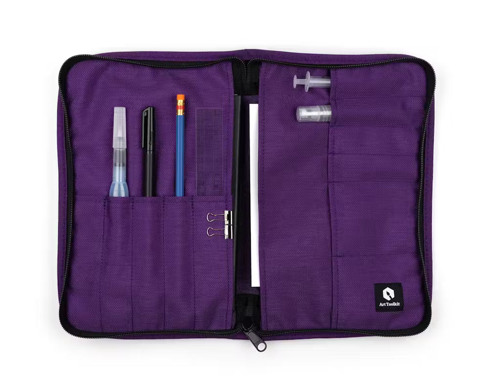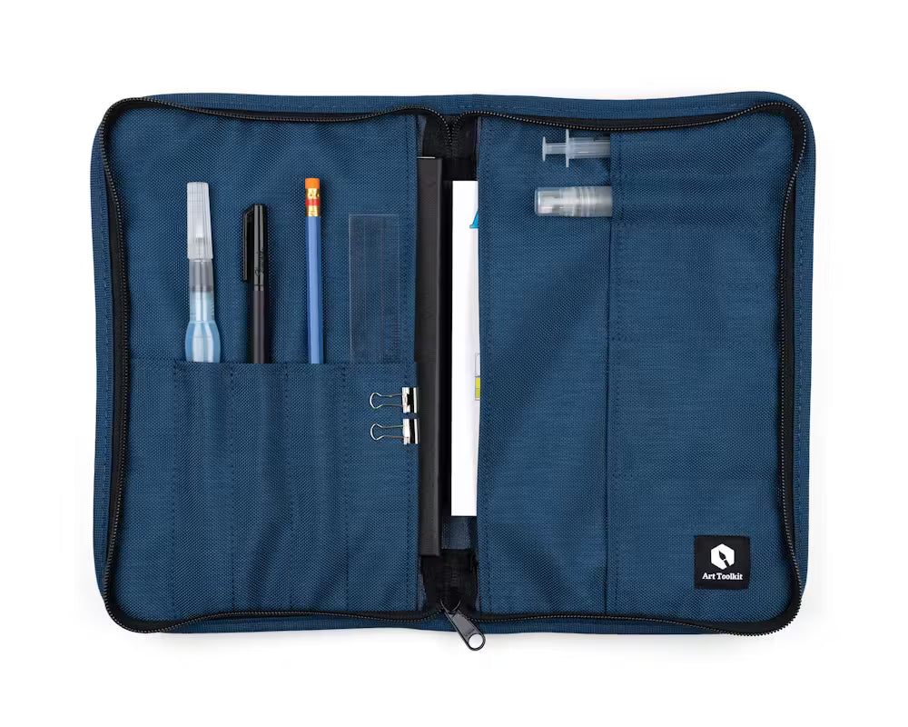 Art Toolkits keep your sketching and watercolor tools organized and readily accessible. Vertical pockets securely hold your mark-making tools, while accessory pockets provide a home for smaller items. Each toolkit features two pockets that perfectly fit our pocket-sized paint palettes, and roomy main pockets offer versatile storage for your sketchbook or loose-leaf paper.