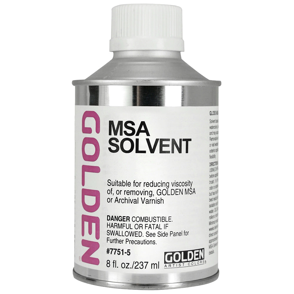 MSA Solvent is the ideal solvent for thinning GOLDEN MSA Varnishes, which must be thinned before use. MSA Solvent assures clear, clean, even application. GOLDEN MSA Solvent can also be used to remove MSA Varnish at a later time for restoration purposes.
