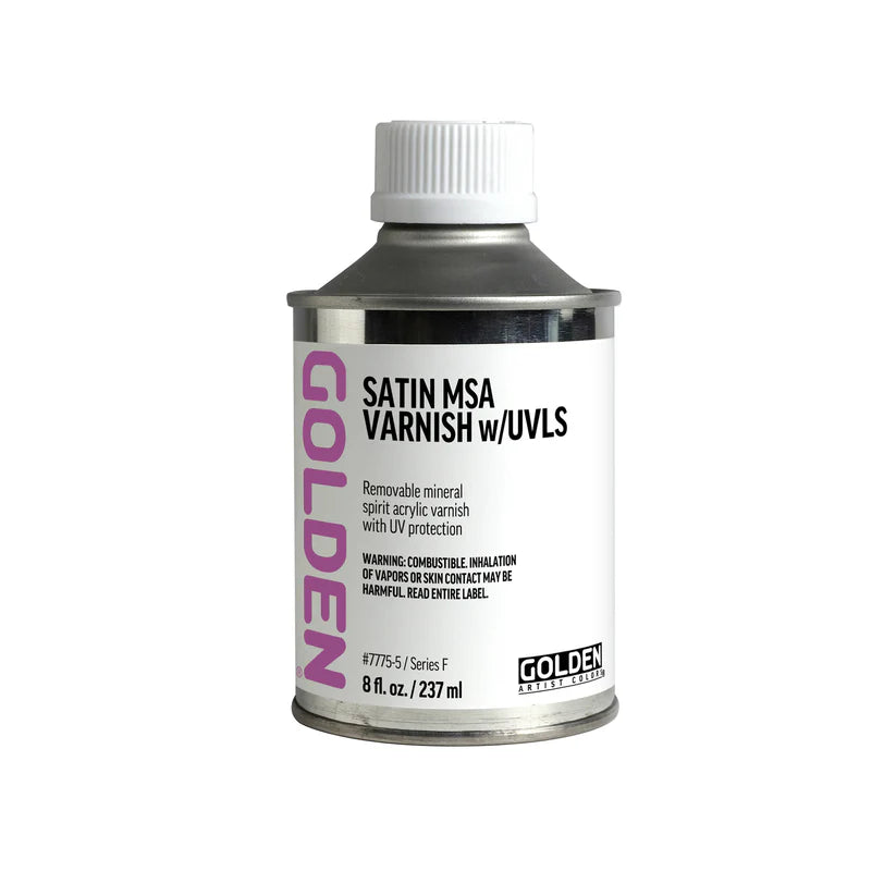 GOLDEN Mineral Spirit Acrylic Varnishes with UVLS (Ultra Violet Light Stabilizers) dry to a tough, yet flexible protective finish. The UVLS system provides increased resistance to the harmful effects of ultraviolet radiation, making the product suitable for exterior as well as interior applications. For restoration purposes, the varnish may be removed with MSA Solvent, full-strength commercial mineral spirits ( i. e.: paint thinner or white spirits ), or distilled or rectified turpentine.