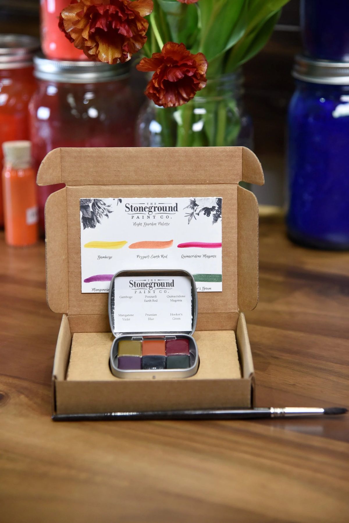Stoneground's Night Garden Palette was inspired by our love of florals and botanicals and is one of our most versatile palettes, useful in everything from landscapes, to still-life and portrait work. This collection of colour is perfect for creating low-key backgrounds and bright, high-key foregrounds, jewel-tone florals and botanicals, interesting skin tones, and dramatic landscapes.