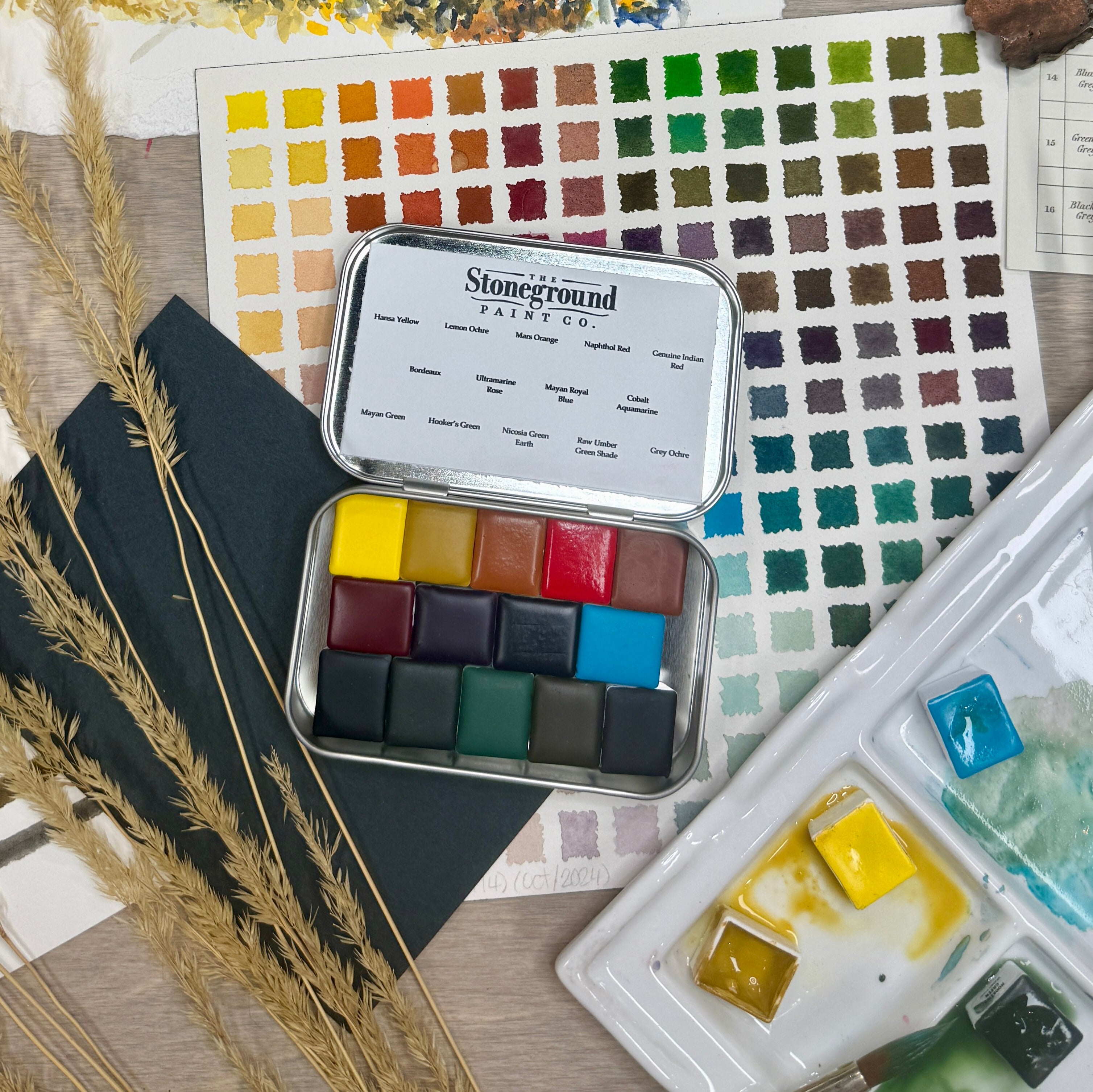 Colours Included: Hansa Yellow (PY 74), Lemon Ochre (PY 43), Mars Orange (PY 42), Naphthol Red (PR 170), India Red (PR 101), Bordeaux (PR 12), Ultramarine Rose (PR 259), Mayan Royal Blue (P N/A), Cobalt Aquamarine (PB 36), Mayan Green (P N/A), Hooker’s Green (PG 7), Nicosia Green Earth (PG 23), Raw Umber Green Shade (PBr 7), Grey Ochre (P N/A)