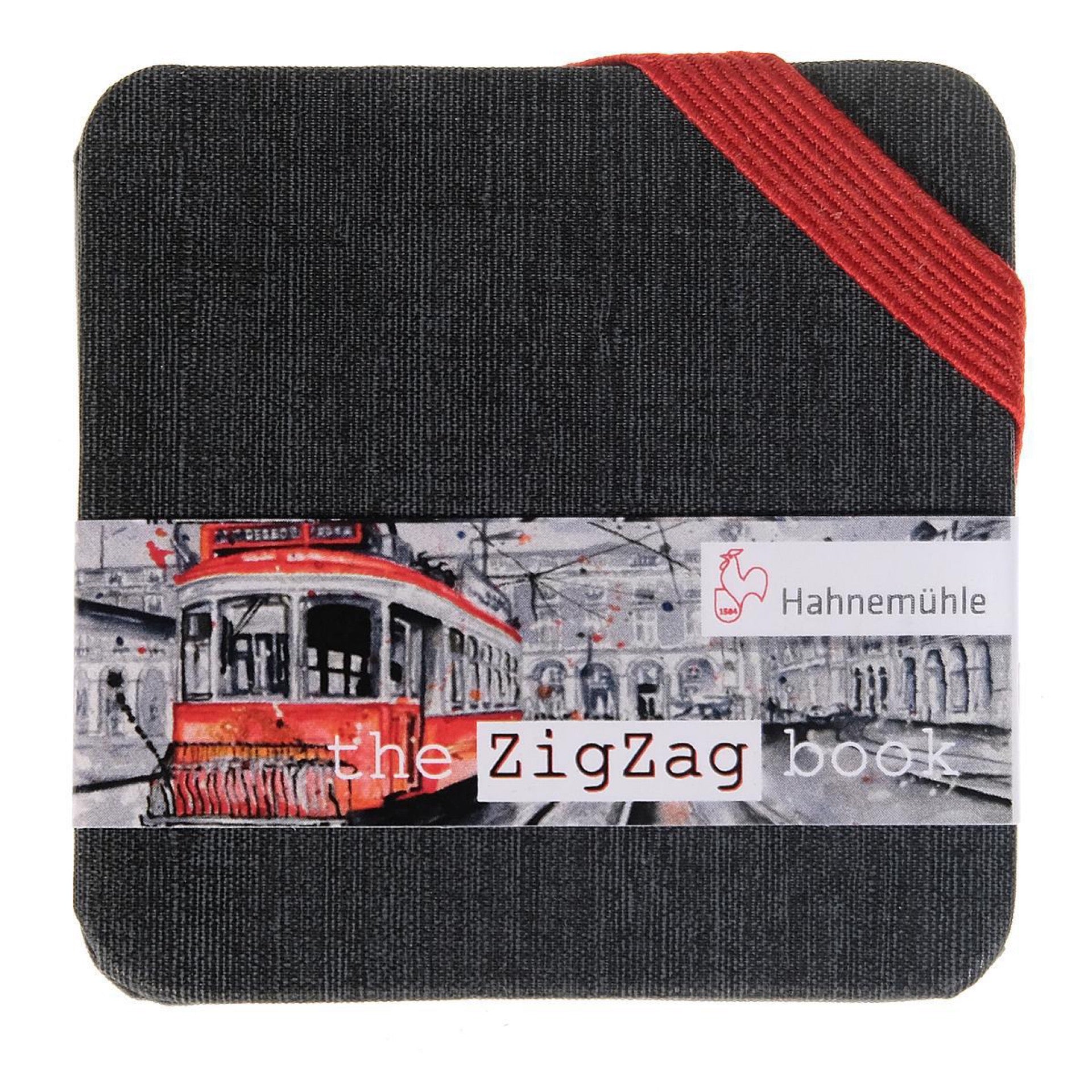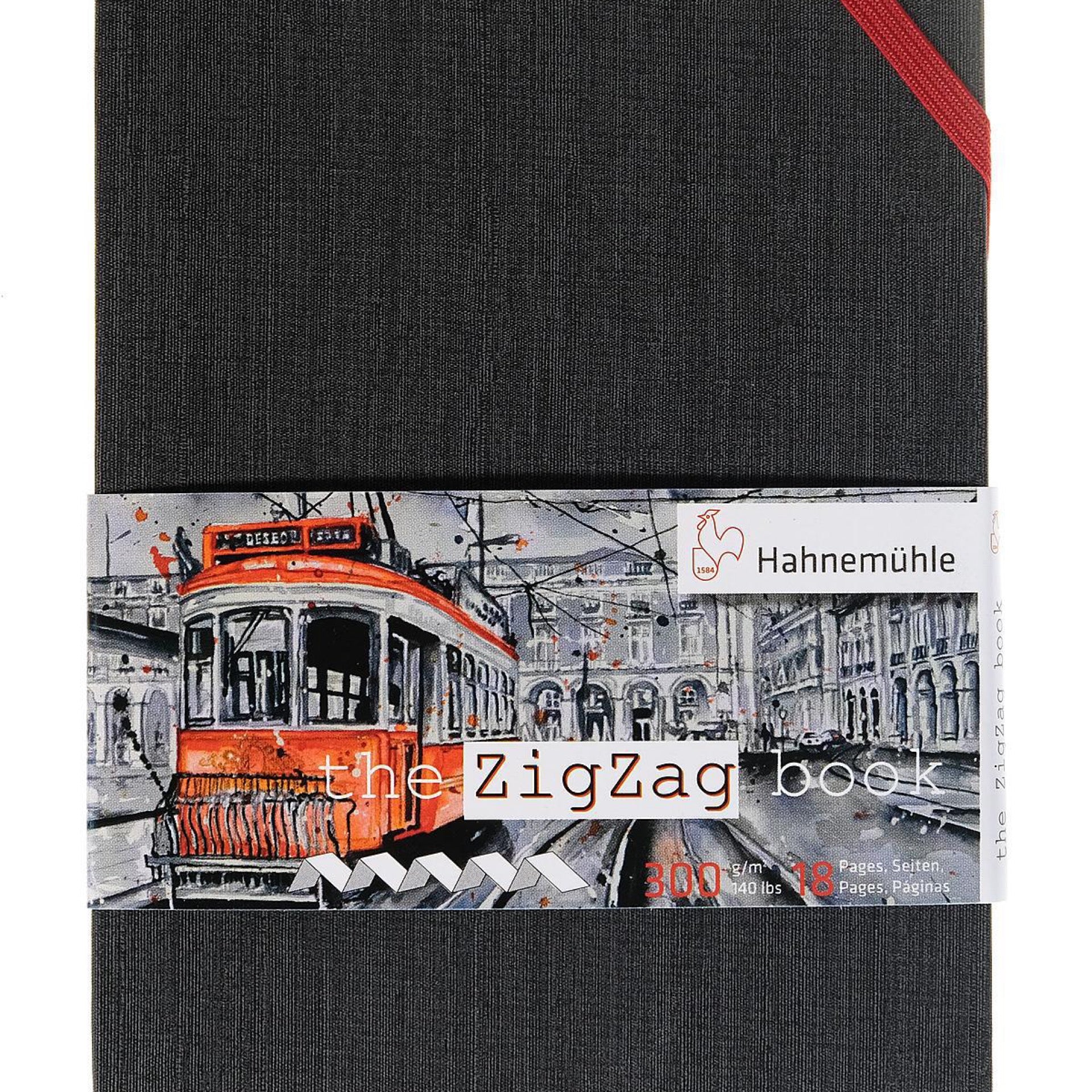 Rugged oversized book covers help to protect the content. Due to its durable cover, the ZigZag book is inured to outside influences. An eye catching red band in the upper right corner can be used to close the book securely. The rooster on the backside underlines the exclusivity of the Hahnemühle creative prowess.