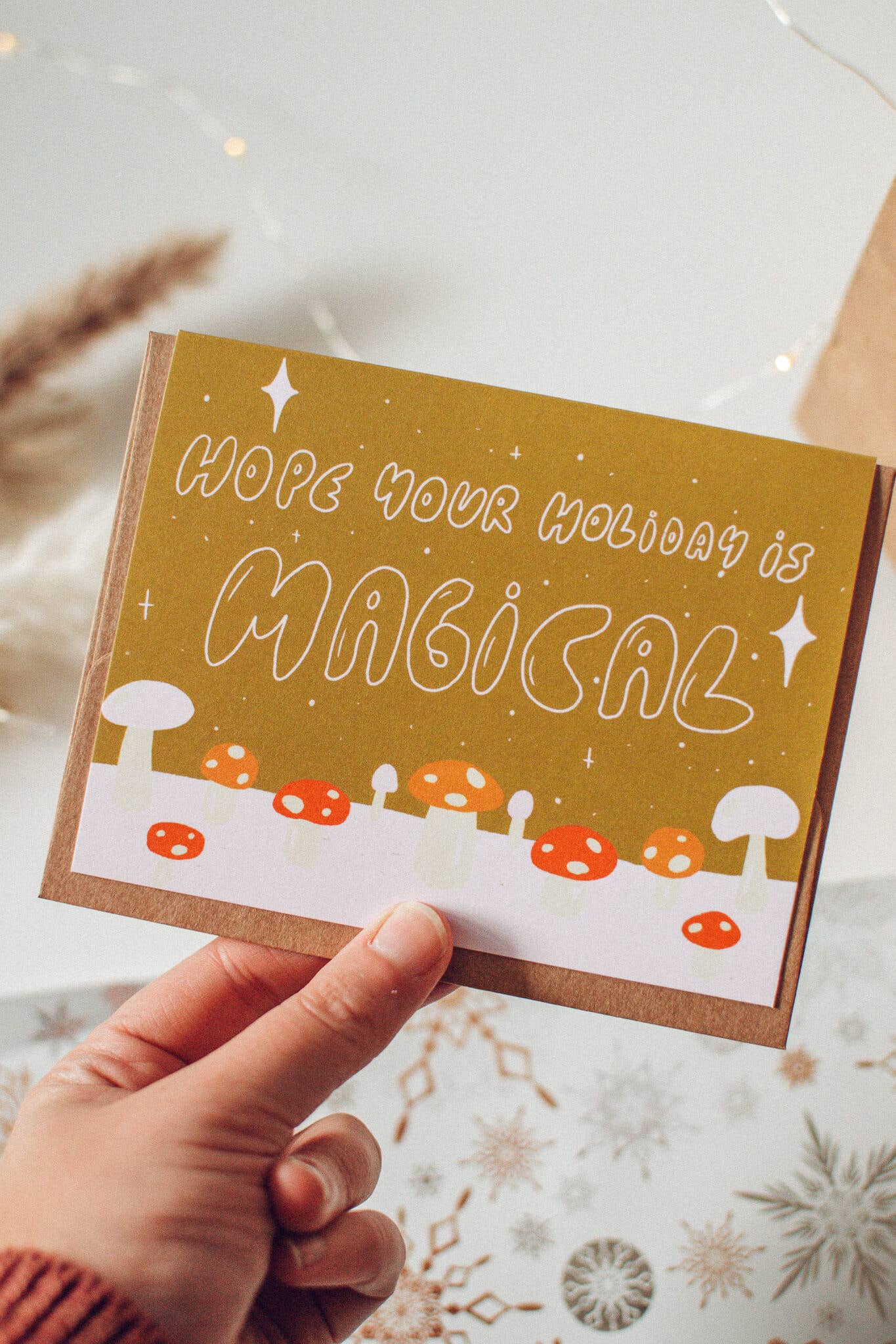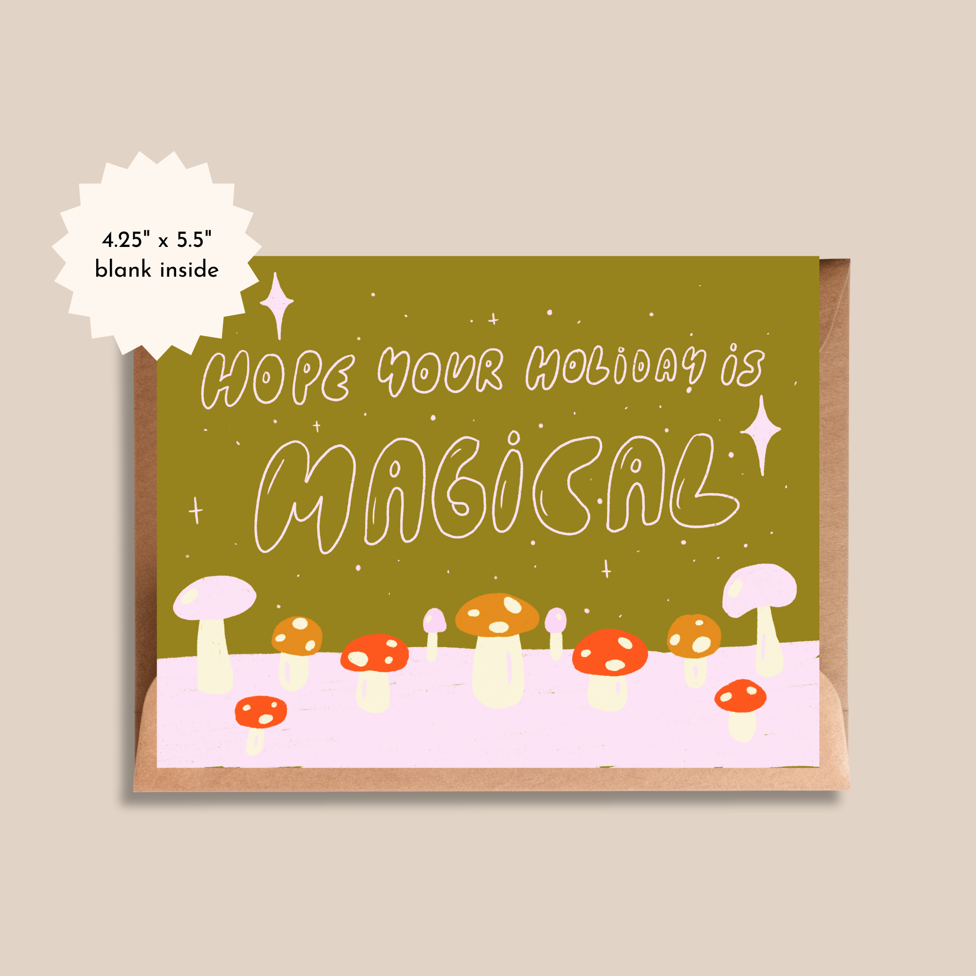 A little holiday magic with a mushroom twist. This vibrant card features hand-drawn mushrooms in a snowy landscape, with a bright, nontraditional palette of acid green and pink. “Hope your holiday is magical” on the front keeps it whimsical, and the blank interior leaves space for any kind of message.